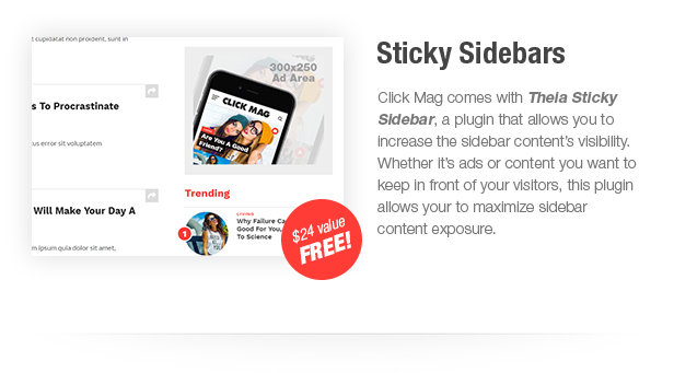 Sticky Sidebars – Click Mag comes with Theia Sticky Sidebar plugin ($18 value!) that allows your sidebar content to follow the visitor as they scroll down the page. This allows for longer visibility for ads and other important information that you want to keep in front of your visitors.